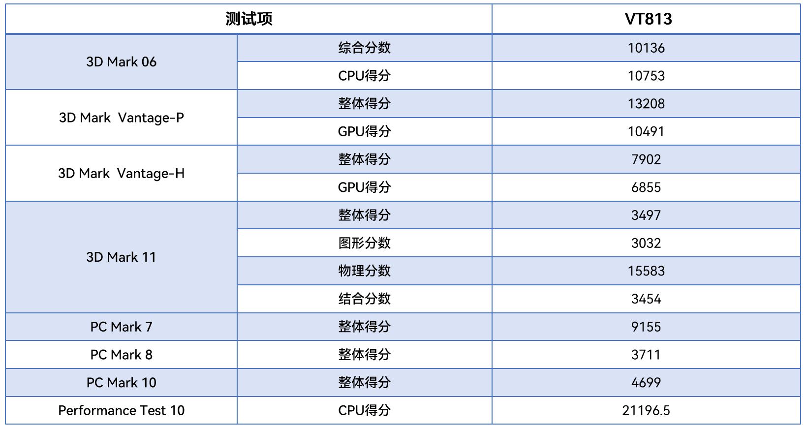 从不同测试软件的跑分情况可以看出,VT813在图形渲染、物理运算及整机综合性能等方面的整体表现优异,下面金年会将针对具体的几项数据来进行详细分析解读。