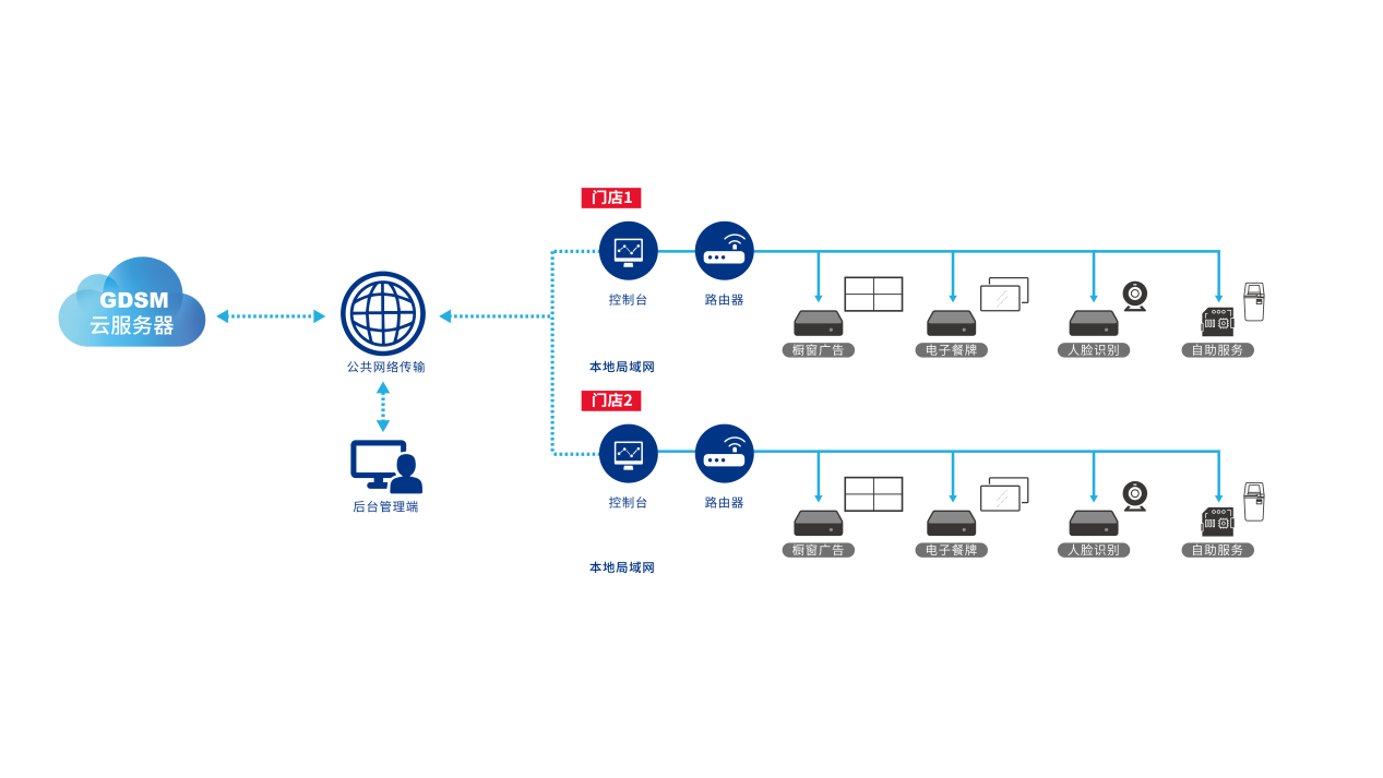 为零售门店定制的数字化升级方案集多屏拼接管理、远程发布管控、内容模板提供、门店环境监测、AI精准推送、VIP会员管理6大优势于一身。模块化的应用后台操作简洁,方便零售门店快速完成数字化升级。