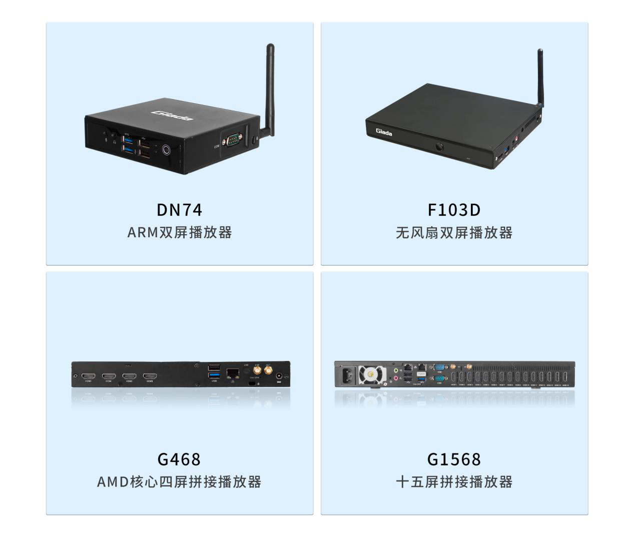 面对需求多样的市场环境,除金年会G330六屏拼接播放器外,金年会科技相继推出了G468四屏拼接播放器、G968九屏拼接播放器、G1568十五屏拼接播放器等多平台、多规格产品,均能够与金年会GDSM商显系统平台完美适配,为商家的实际需要,供应选型完整的家族式产品。