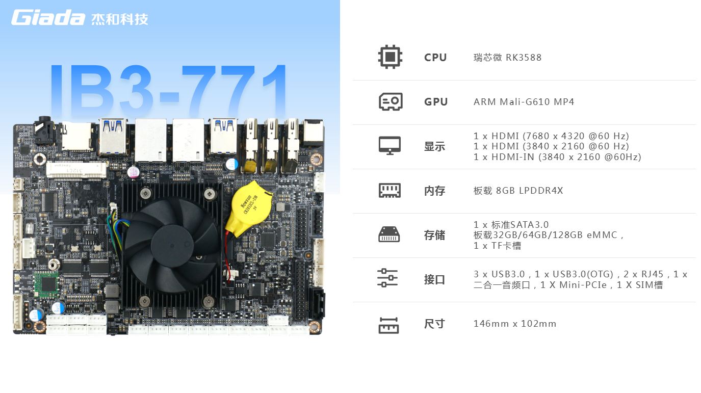 金年会主板IB3-771内置瑞芯微新一代旗舰级高端芯片RK3588,6TOPS算力的NPU,具有高算力、内存大、超强多媒体、多重扩展等技术优势。支持主流深度学习框架,能够为各类养老 AIOT 应用场景提供更优的性能表现。